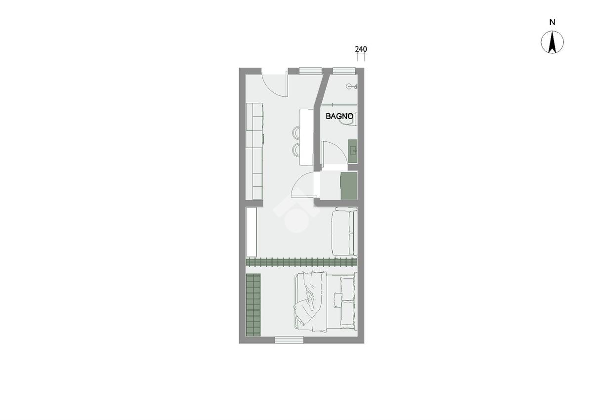 L’appartamento è composto da ingresso su cucina, camera matrimoniale, antibagno con zona lavanderia, bagno finestrato e cantina di pertinenza.